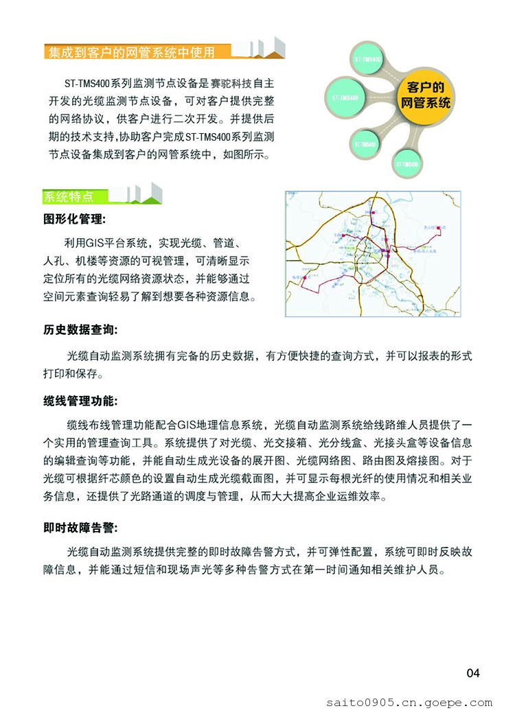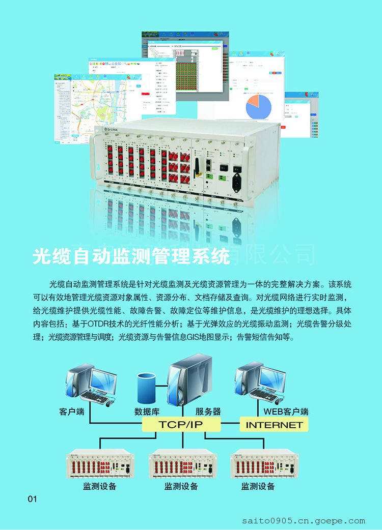 按监测光路的连接方式,光缆线路自动监测系统可分为在线监测和备纤监测两种方式。在告警反映实时性上,在线监测方式要优于备纤监测方式;在系统的可靠性上,备纤监测方式由于不介入通信设备与线路,因此其系统可靠性*高;在实施上,备纤监测方式难度*小。在线监测方式将与工作波长不同的测试波长,通过WDM 设备合波在同一根光缆中传送远端则利用滤波器将测试波长滤除而让工作波长通过。